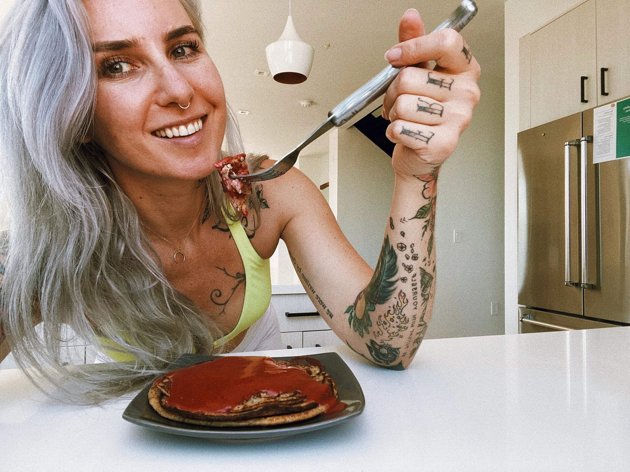 I missed pancakes, but hadn’t made them since I became vegan and gluten-free, so I had no idea what to do. Most pancake recipes are filled with dairy, sugar, and other unhealthy ingredients, so I decided to develop my own super simple, sweetener-free, vegan and gluten-free recipe! I also added on a delicious, clean, 2-ingredient sauce.